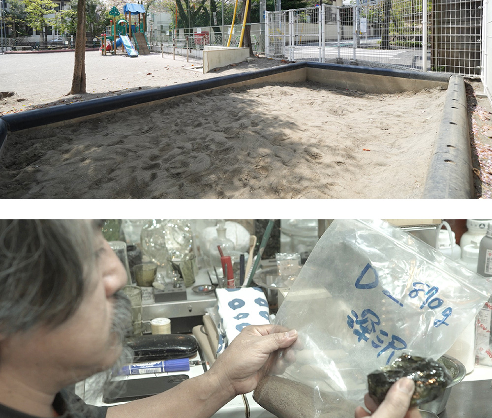 砂場を見た時に、以前一緒に仕事をしたガラス作家の村山耕二さんが思い浮かびました。村山さんはいろいろな土地の砂を焼成してガラスをつくり、それを素材に作品をつくるアーティストで、彼に砂場の砂を使って作品をつくってもらおうと考えました。