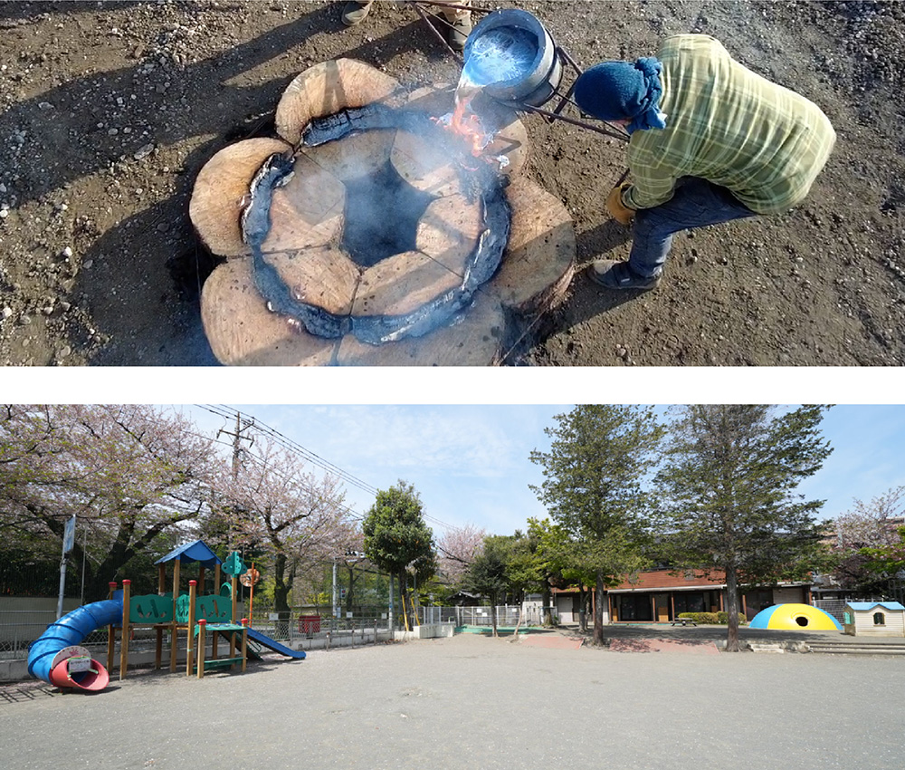 制作にあたっては、幼稚園のシンボル的な存在だったアカマツと園舎にあったウッドデッキ、それから子供達が遊んでいた場所の地面そのものを型として使いました。円相が設置されている場所は作品制作のために炉を築いた場所とほぼ同じです。鋳造作品をつくるアーティストさんの多くは精巧な型をつくり、長い時間とプロセスを経て作品を仕上げていきます。しかし、僕は時間をかけることで勢いやダイナミズムが失われてしまうように感じていて。そこで今回は、この場所で型をつくり、この場所で金属を融かして流し込むというスタイルを取りました。これにより、荒々しい作品にはなりますが、融けた金属が流れる勢いであるとか、熱さからくる熱量がそのまま作品に出せたように思います。