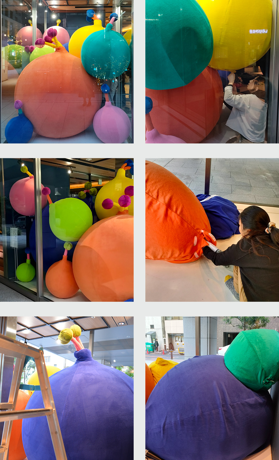 松永さんの作品は、街中ではっと目を引くほど目立っていました。カラフルなその色合いに引き寄せられると、そこには温かい触感の布に覆われたいくつもの植物の種子が芽吹いたというか、ひょっこり目をだした生物のようなものがひしめき合い生きていて、その感じが、頼もしくもあり、楽しそうでもあり、、元気が出てくる光景でした。美術でダイレクトに人に伝わってくることの大事さを確認しました。