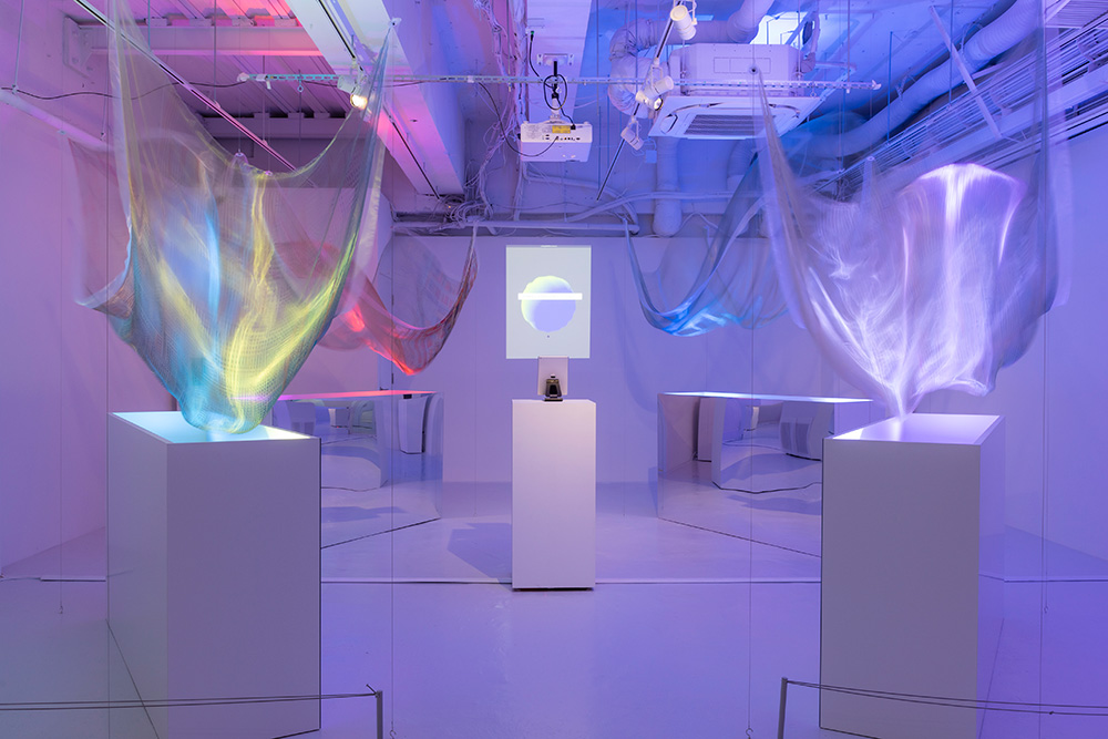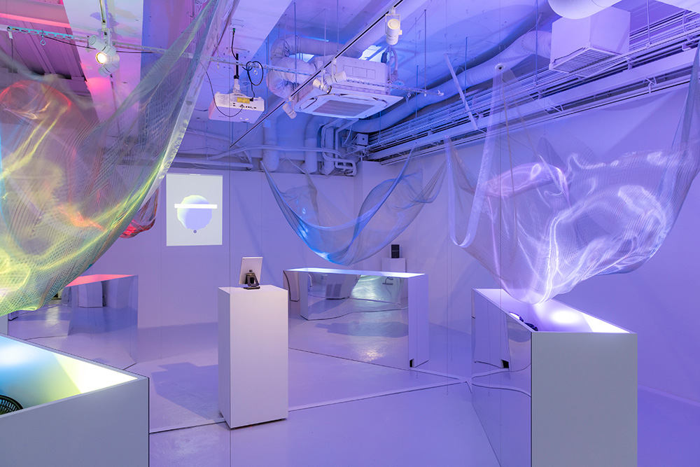 今回、窪田氏は18件のAI特許を取得している立場から、ChatGPTを改造し、質問から答えまでの“あいだ”を余白として表現しました。ユーザーの入力した文章を“喜怒哀楽”に分類し、4つの布の動きで見えない空間を可視化しました。