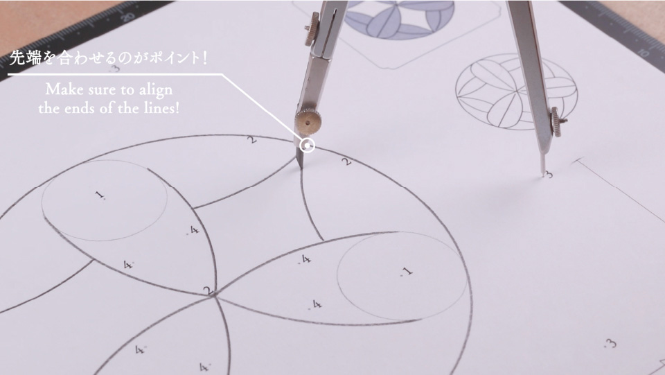 「円と線」の組み合わせで描かれている家紋。専用の型紙を使って、コンパスと定規、鉛筆で描く家紋作成体験をお子様向けに開催いたします。