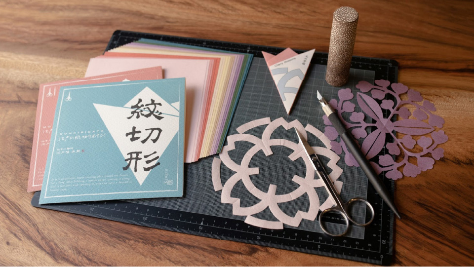 折り紙を折りたたみ、型紙の通りに切り抜いて、折り紙を開くと家紋が出来上がるという、江戸時代に流行した紙切り遊び「紋切形」体験をお子様向けに開催いたします。