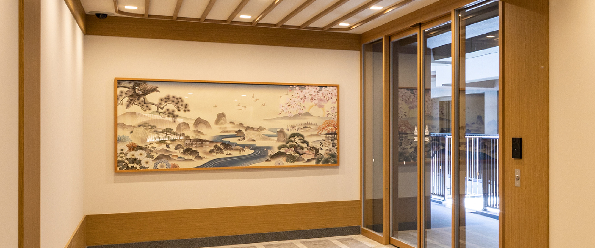 Brillia 京都松ヶ崎は共用部のコンセプトとして“バイオフィリックデザイン”があると聞きました。敷地周囲は樹木で覆われ、高野川のせせらぎや虫の声、風の音などが“サウンドスケープ”として流される。また自然光を取り入れた和の趣あふれる空間になるとのことでしたので、私のアートも主張しすぎず、でもたまに足を止めて眺めたくなる、そんな作品を目指しました。周囲の景観や歴史を盛り込んでほしいという依頼がありましたので、高野川のほとりにマンションが佇んでいる様子を中心に、桜と紅葉が同時に描いて四季の移ろいを表現したり、京都の文化であるお茶を立てている人がいたり、京都五山送り火の1つである「法」の字が浮かび上がらせたり、さまざまな要素を取り込んでいます。